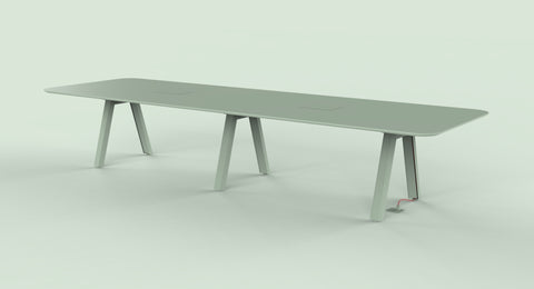 Timber Table can accommodate a custom size top and power integration. Each leg includes an opening at its base or seamless cord management from trough to leg. While we have a comprehensive offering of finishes, you can powder coat the base in any standard RAL color, though minimum order quantities apply and will incur an up charge.