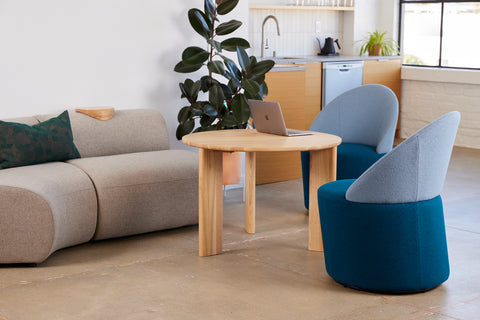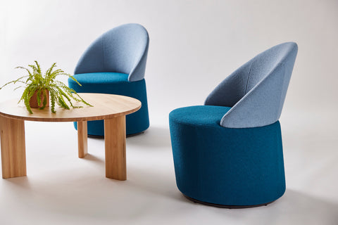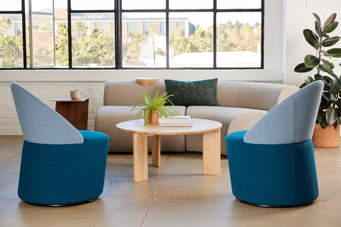 The simple tilt of a circular form defined some of the earliest sketches for the Lean Lounge — and it stuck. This initial gesture defines this small-scale lounge with a gentle “lean” of both base and back. A higher seat height, swivel base, and wrap-around comfort makes this lounge chair suited for both hybrid meeting spaces and lounge areas, supporting various seating postures for various settings. A split upholstery option accentuates the acute angled profile and invites both your gaze and place to sit.
